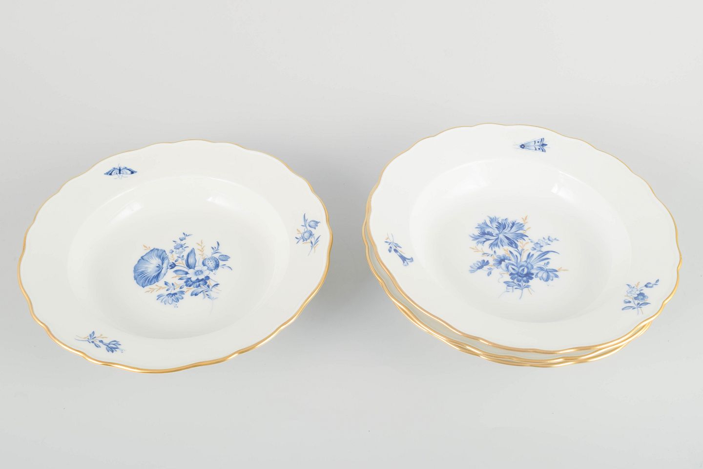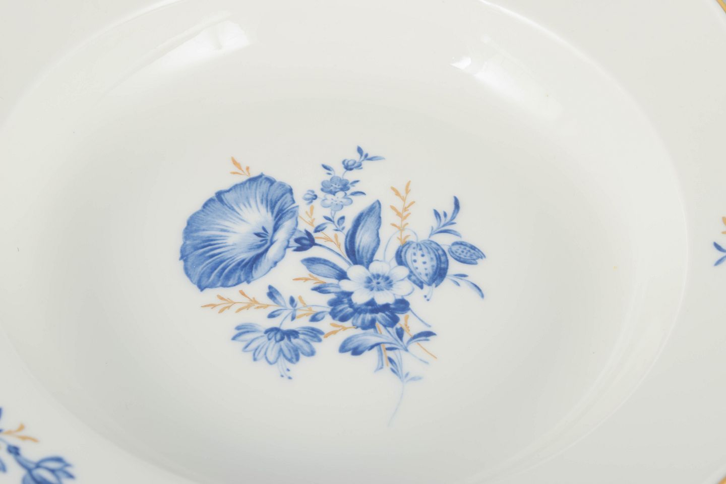 Hånddekoreret porcelæn med håndmalet blå blomsterdekoration og forgyldte stafferinger langs kanten. Klassisk bølget form.
