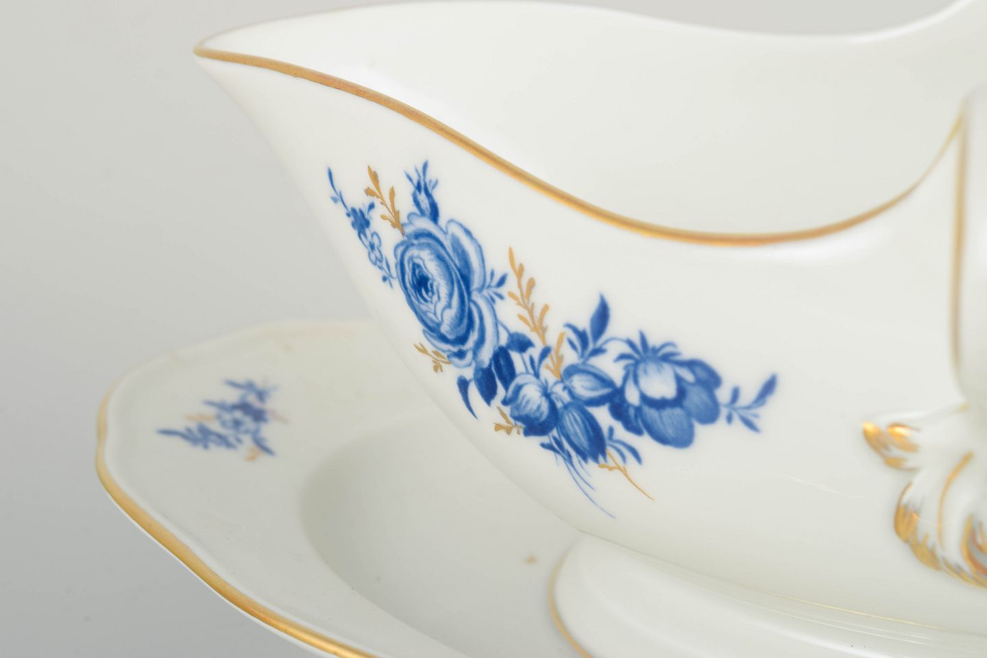 Hånddekoreret porcelæn med håndmalede blå blomsterdekorationer og forgyldte stafferinger langs kanter og hank. Elegant asymmetrisk form med dobbelt hank.