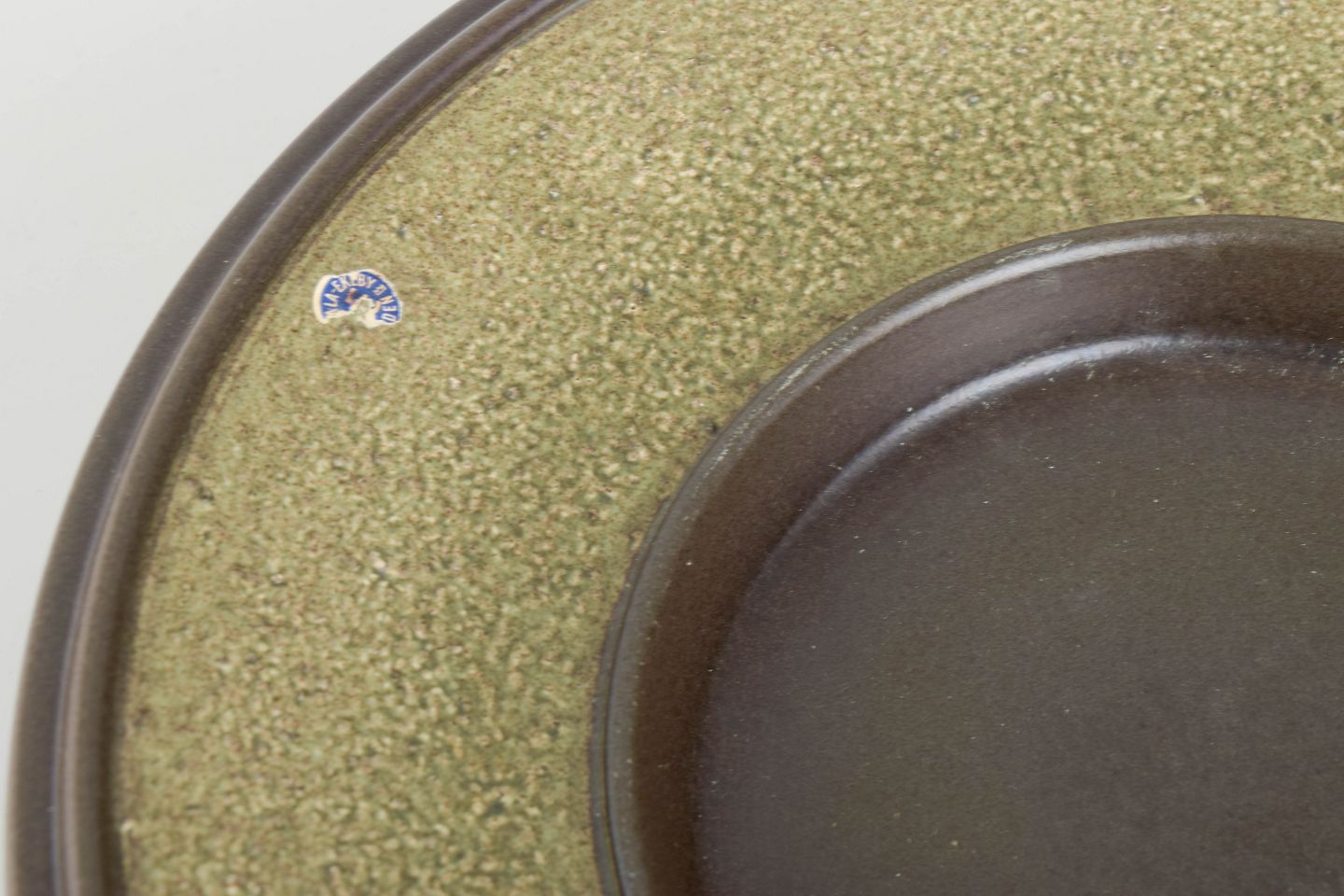 Hånddrejet stentøjsskål med organisk form og dybt tekstureret glasur i dæmpede grønne og brunlige toner, karakteristisk for Simmulsons ekspressive formsprog fra perioden.