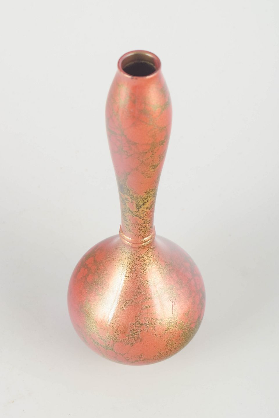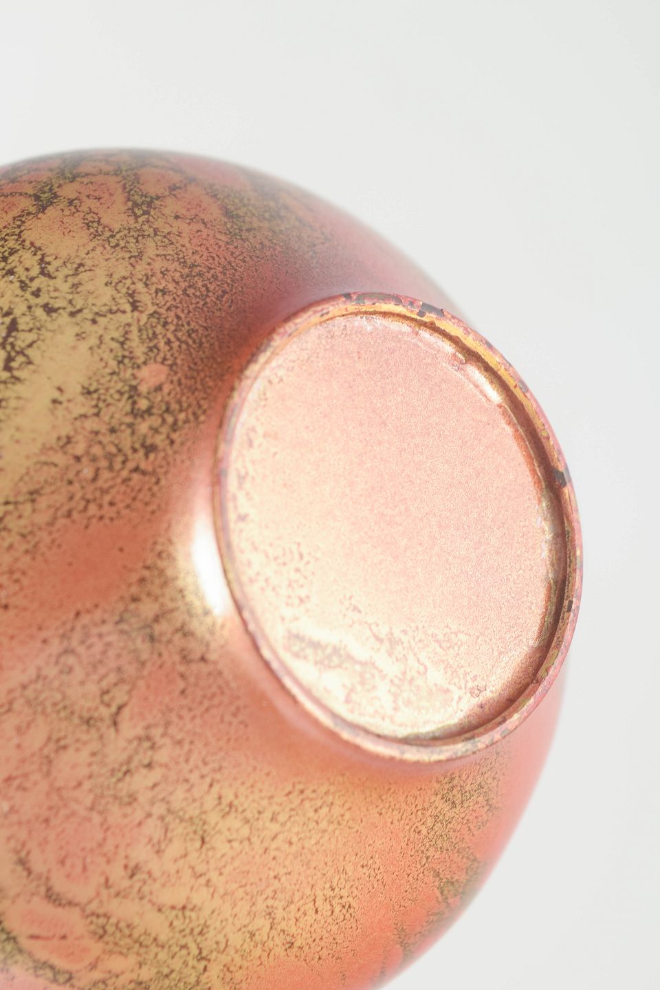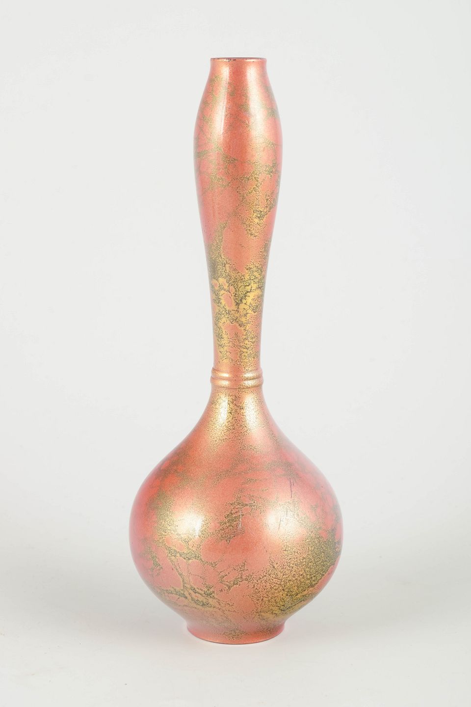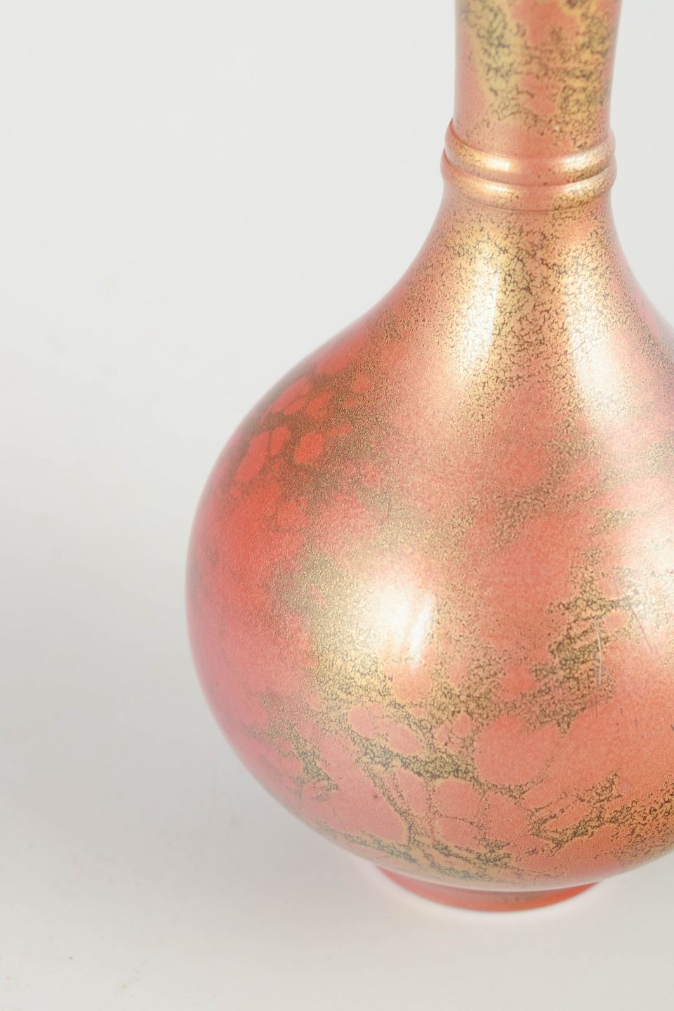 Elegant elongated metal vase featuring traditional Japanese murashido enamel glaze in warm rosé and gold tonalities with iridescent effect and organic marbled patterning.