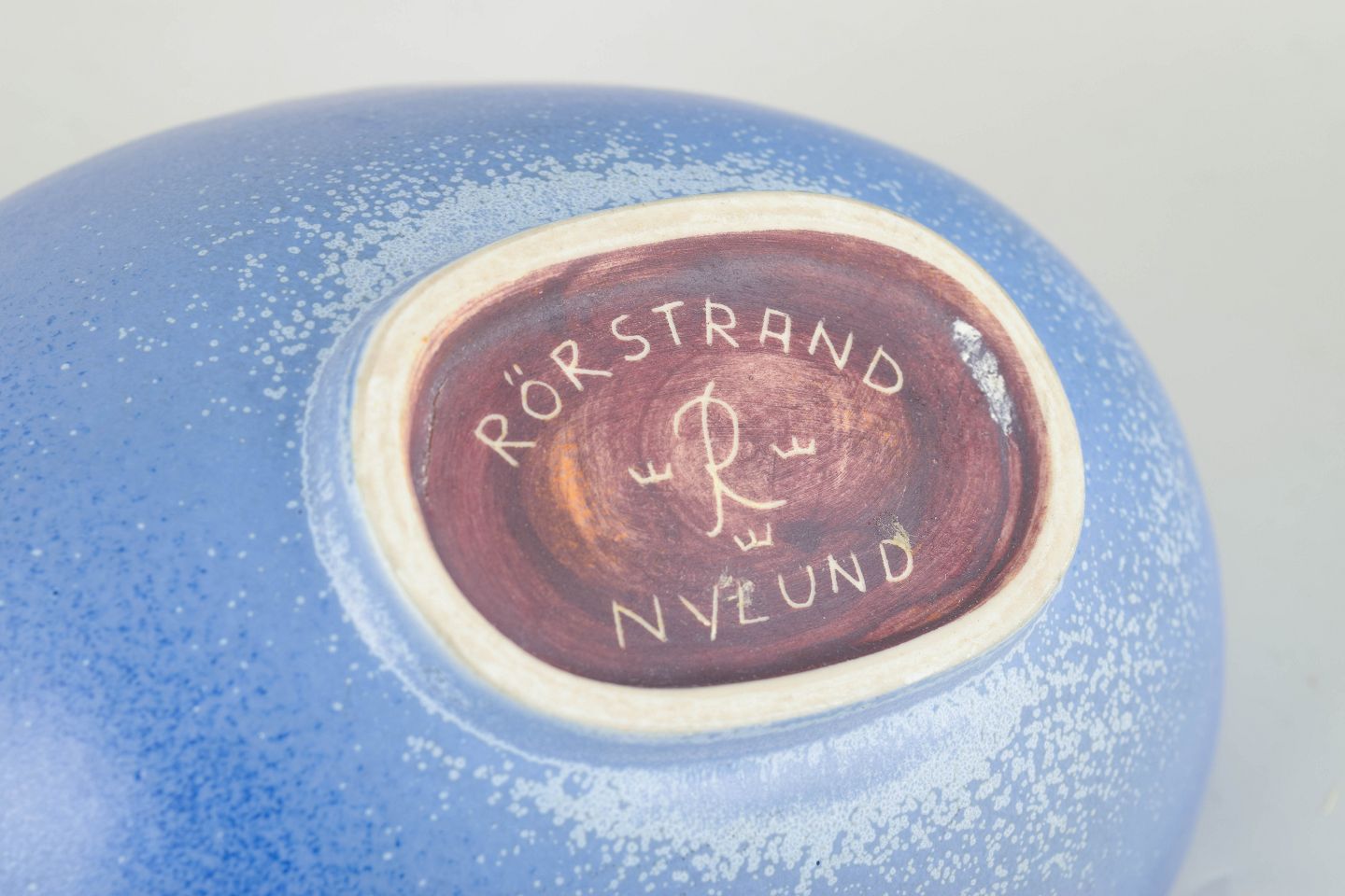 Elegant stoneware bowl with a soft, organic form and matte blue glaze with a finely speckled surface — a characteristic example of Nylund’s refined sense of proportion and subtle color harmony. The bowl reflects the calm modernist aesthetic that defined Rörstrand’s mid-century production.