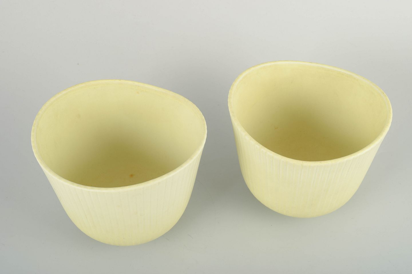 Pair of ceramic flowerpots in the characteristic “Vinda” shape with gently asymmetrical, undulating rim and fine ribbed surface. Glazed in a soft pale yellow tone. Marked “Gustavsberg Sweden” to the base.