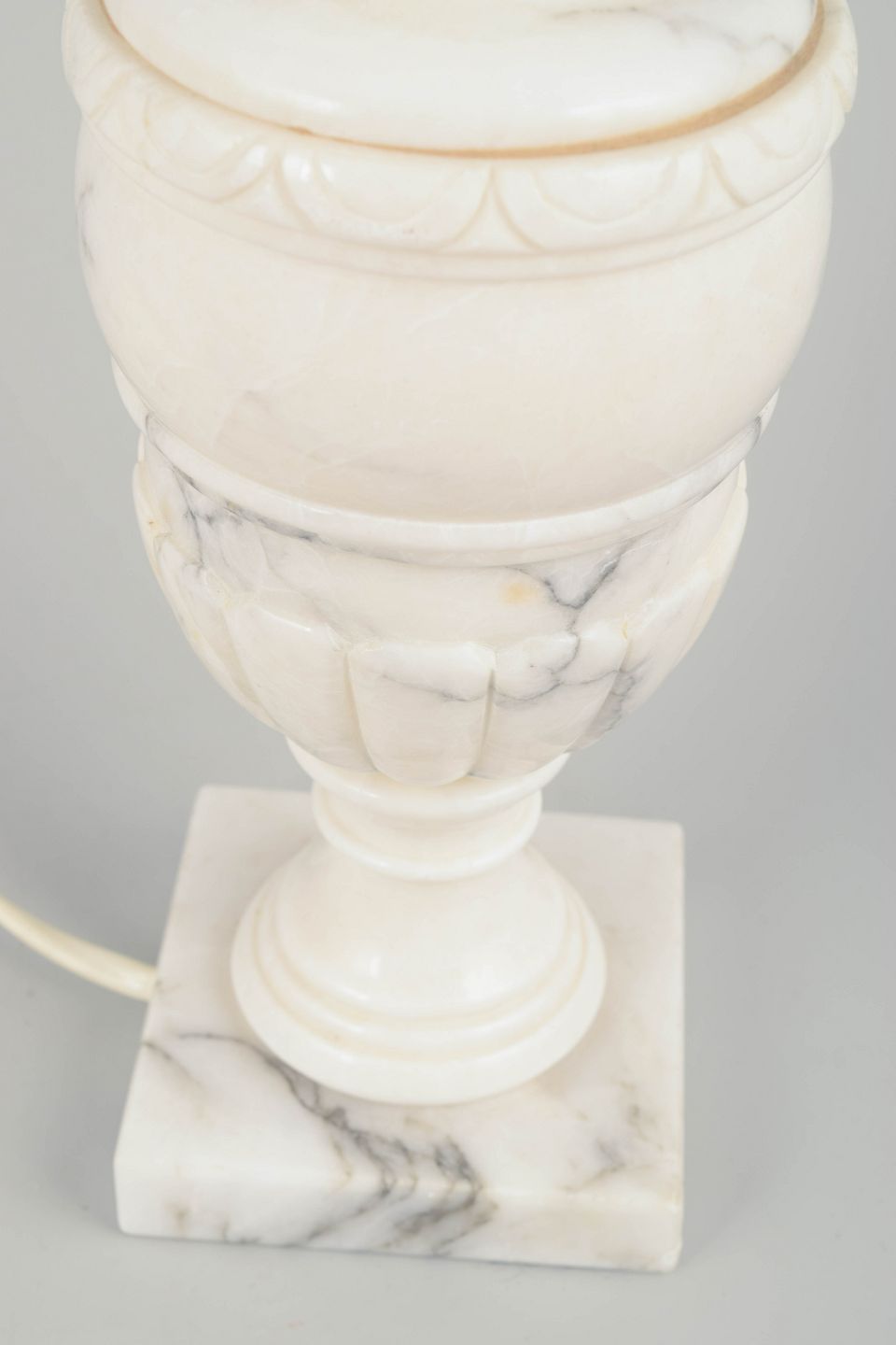 Klassisk urneformet bordlampe udført i alabast med firkantet fod og dekorativ guldfarvet ringdetalje. Et elegant eksempel på italiensk håndværk, der kombinerer klassiske proportioner med alabastens naturlige translucens.