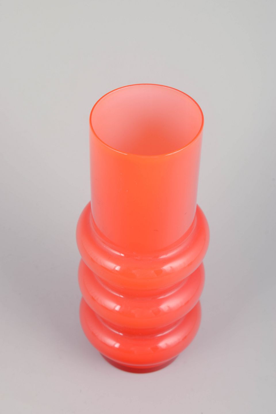 Mundblæst vase i intens orange glas med markant, skulpturel form bestående af cylindrisk krop med tre afrundede bånd. Et karakteristisk design fra 70’ernes svenske glaskunst, hvor form og farve blev brugt som dekorative virkemidler.