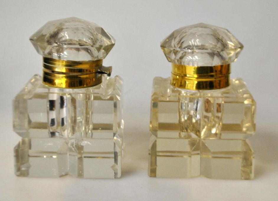 Antique writing set in brass with crystal containers, 19th century Germany.