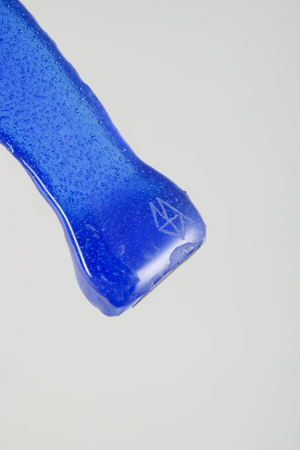 Håndformet figur udført i intenst koboltblåt glas med metallisk skær og minimalistisk formgivning. Et skulpturelt værk, der forener menneskets silhuet med Ekegrens karakteristiske eksperimenterende udtryk og farvedybde.