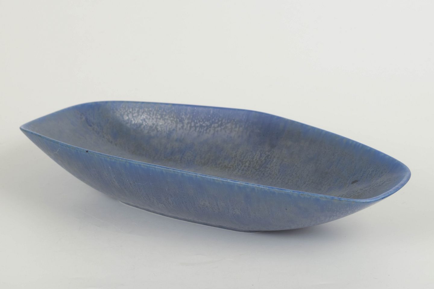 Elegant, lav skål i stentøj med bådformet profil og mat blå glasur med nuancer i kornet struktur.