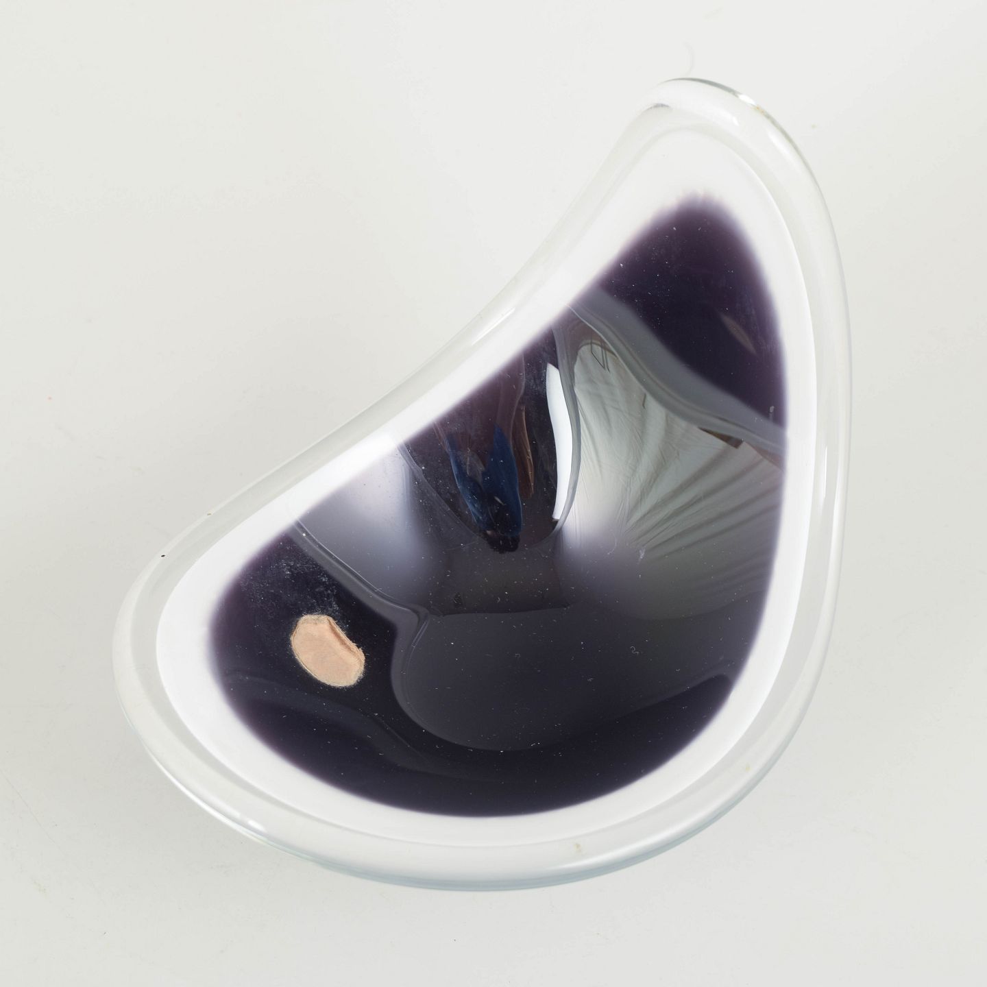 “Coquille”-skål i flerlaget kunstglas med dyb grå/sort indfarvning og hvidt mellemlag, omsluttet af klart yderglas. Den asymmetriske, opadbuede form er karakteristisk for Kedelvs organiske mid-century design.
