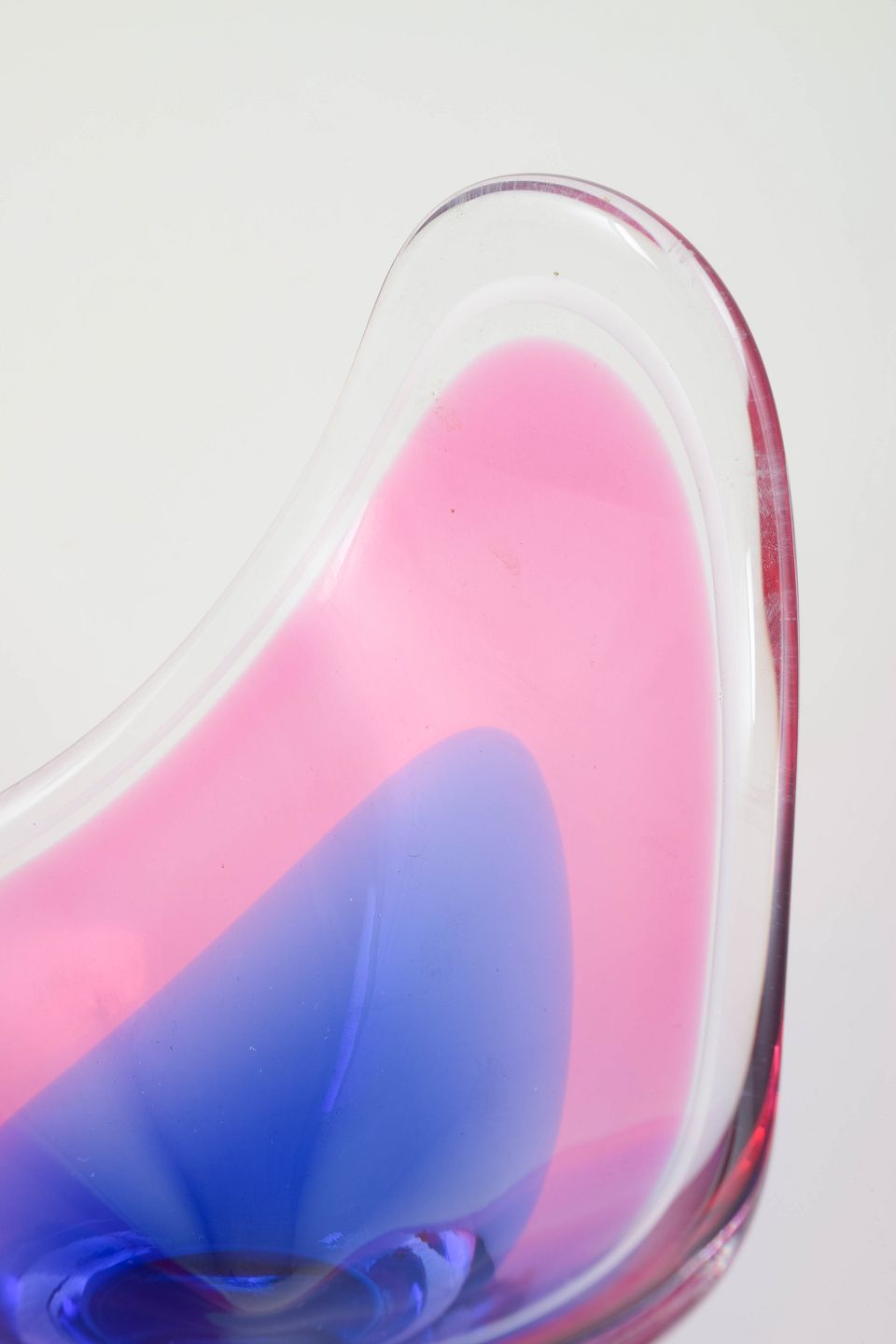 Elegant “Coquille” bowl in layered art glass with pink and blue interior tones, featuring an organically lifted form encased in clear glass.