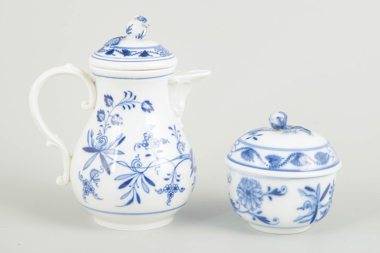 Håndmalet porcelæn fra Meissens klassiske løgmønstret serie. Sættet består af en lille sukkerskål med låg samt en elegant mokkakande med låg og hank. Begge dele er smukt dekoreret med de karakteristiske blå blomster- og rankemotiver.