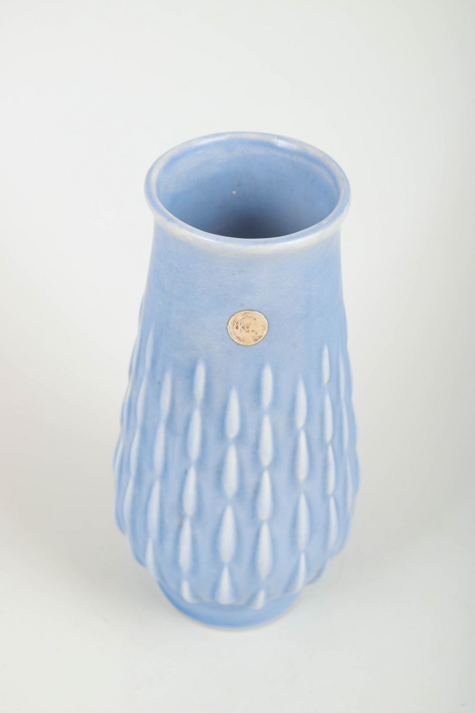 Håndlavet fajancevase i lyseblå glasur med reliefdekoration og original Bo Fajans-etiket bevaret. Model D382. Elegant cylinderisk form med organiske, dråbeinspirerede vertikale mønstre.