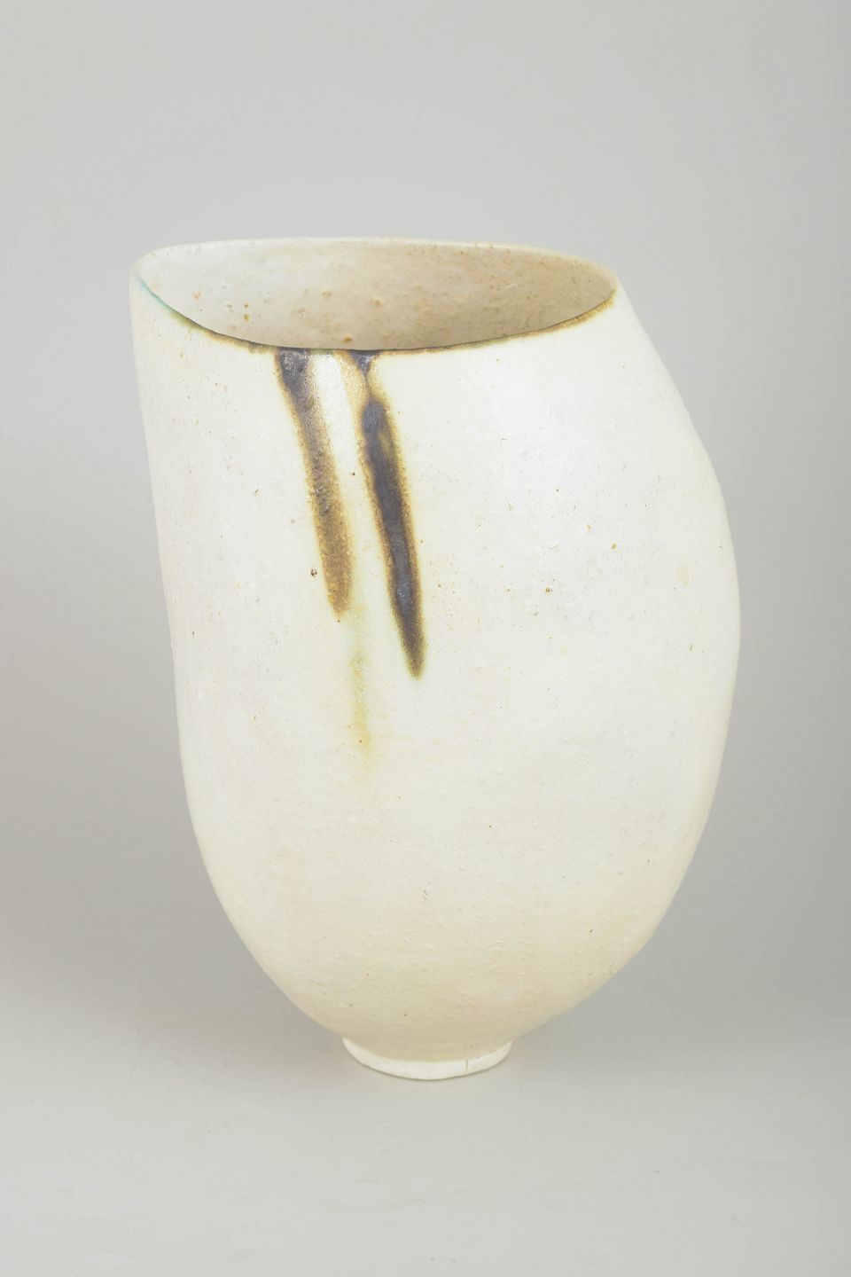 Skulpturel, håndbygget studiovase i stentøj med let asymmetrisk form, rå hvid overflade og minimalistisk penselstrøg-dekor i mørke brune og sorte nuancer.