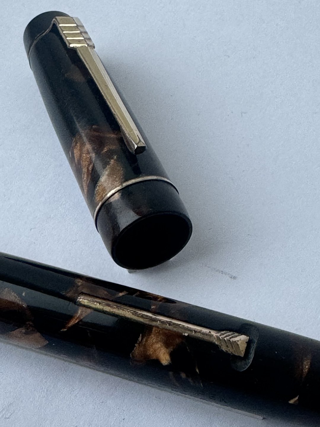 Black and brown marbled Croxley fountain pen. Lever filler ink refill system. New rubber sack must be inserted before the pen can absorb ink and write again. Unoriginal 14 carat gold nib. Length: 12.5 cm