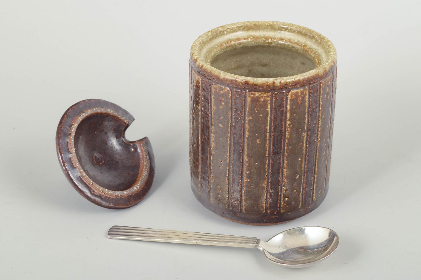Hånddrejet stentøjskrukke med fast låg i brun Palshus-glasur og karakteristisk lodret rillet dekoration. Indhak til ske.