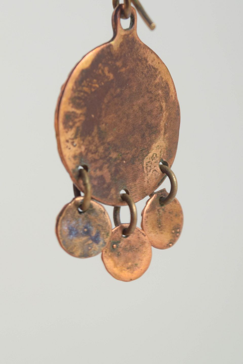 Par dekorative bronzeøreringe i Laine’s karakteristiske vikingeinspirerede, organiske formsprog. Ophængt medaljon med tre små dinglende elementer.