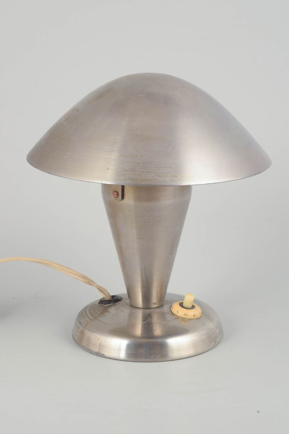 Tidlig modernistisk bordlampe i børstet stål med svampeformet skærm og konisk fod. Et karakteristisk eksempel på tjekkisk funktionalistisk belysningsdesign fra mellemkrigstiden, hvor rene linjer og industrielle materialer dominerede.