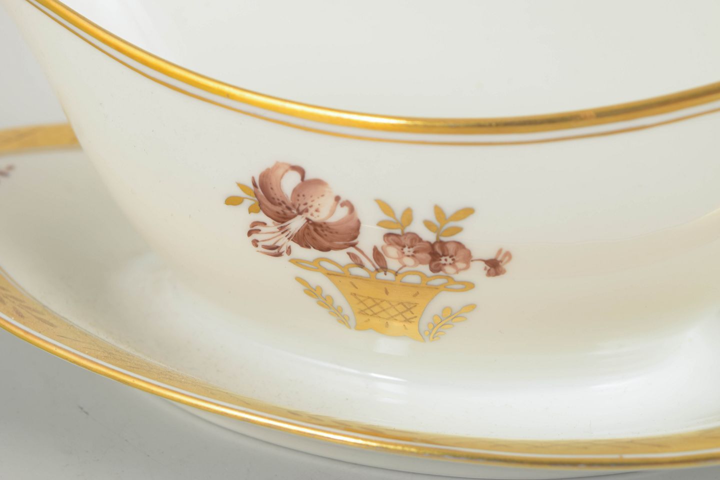 Elegant saucekande i porcelæn fra Royal Copenhagens “Guldkurv”-serie, model 595/9344. Udført med fastmonteret fad, forgyldt kant og det klassiske håndmalede blomsterkurvmotiv.