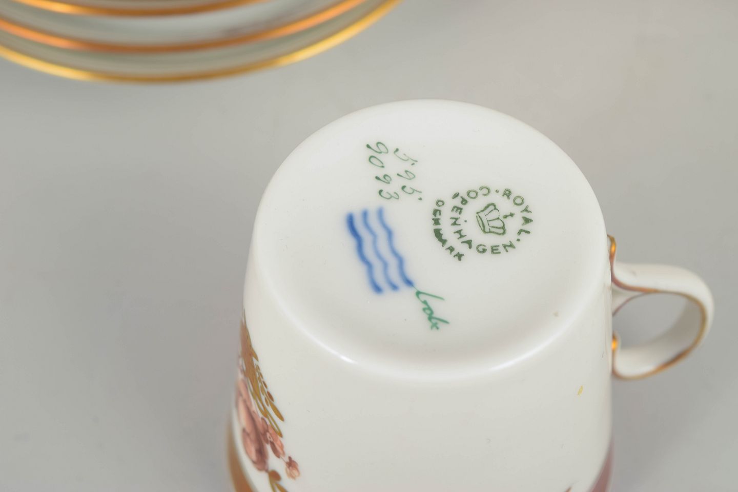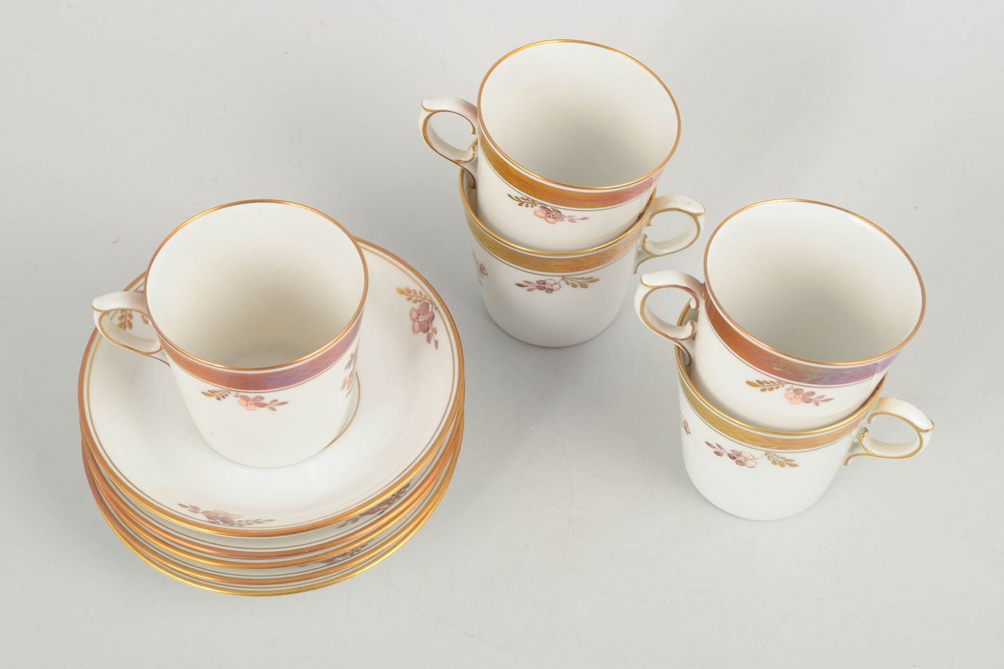 Beautiful set of five demitasse cups with matching saucers from Royal Copenhagen’s “Golden Basket” series, model 595/9093. Executed in porcelain with gilded rims and hand-painted floral decoration.