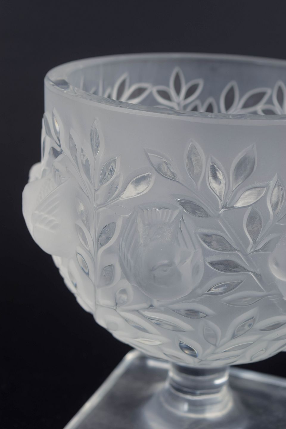 Frostet krystalglas vase på fod med firkantet base, rigt dekoreret med relief af blade og frugter i klassisk Lalique-stil. Den matte overflade kombineret med klare detaljer giver et elegant, skulpturelt udtryk.