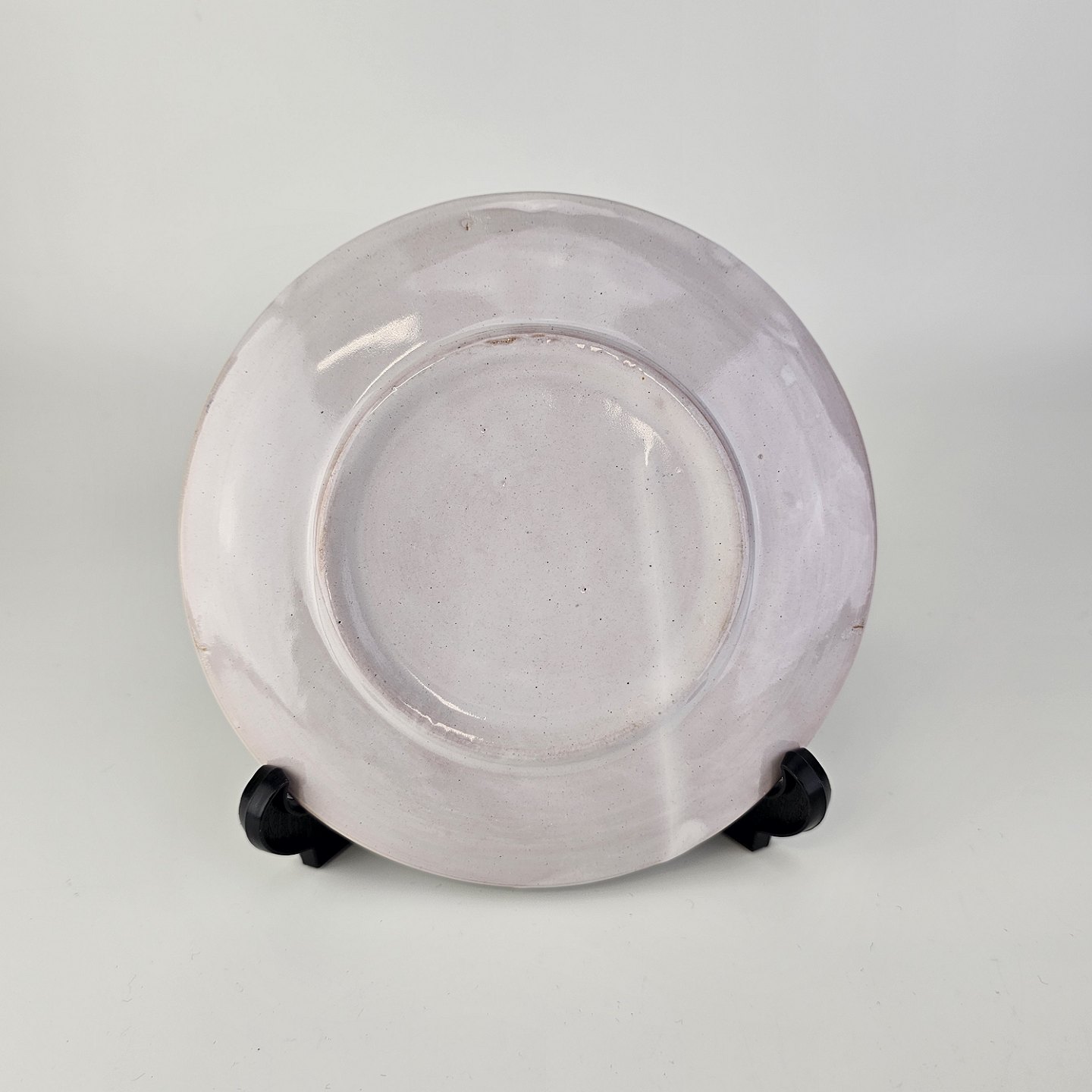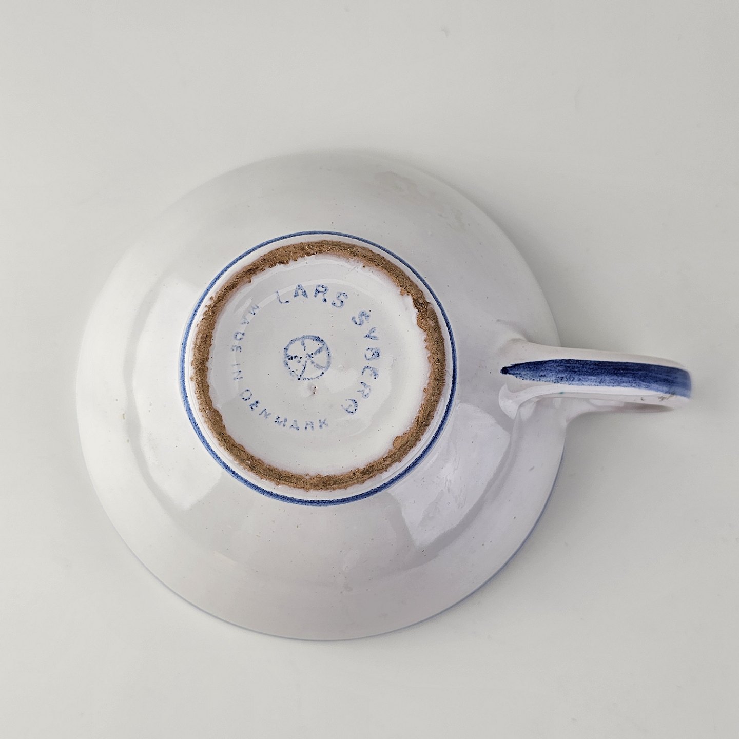 Kop og underkop i keramik med blå detaljer og blomsterdekoration