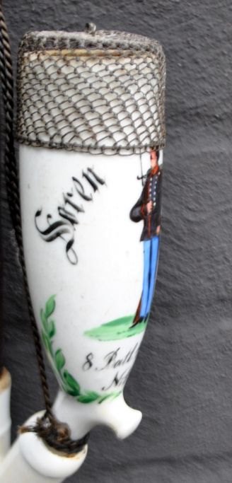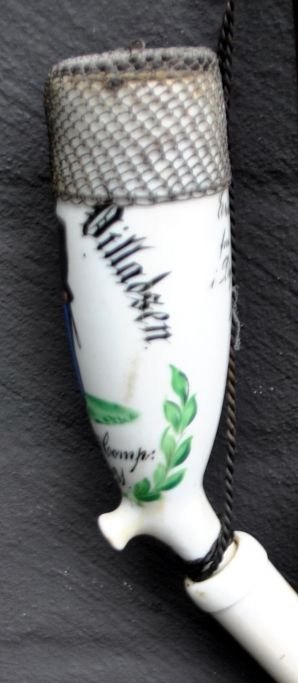 Dansk porcelæns soldaterpibe, 1878, København. Bemalet hvidt porcelæn. Bemalet med teksten: Søren Villadsen, 8 Batl. 4 Comp. N: 431. Erindring fra lejren i Dyrehaven. Med rør af drejet træ og flettet hestehår. Med jerngitter ved pibemunding. Mundstykke af horn. L.: 70 cm.