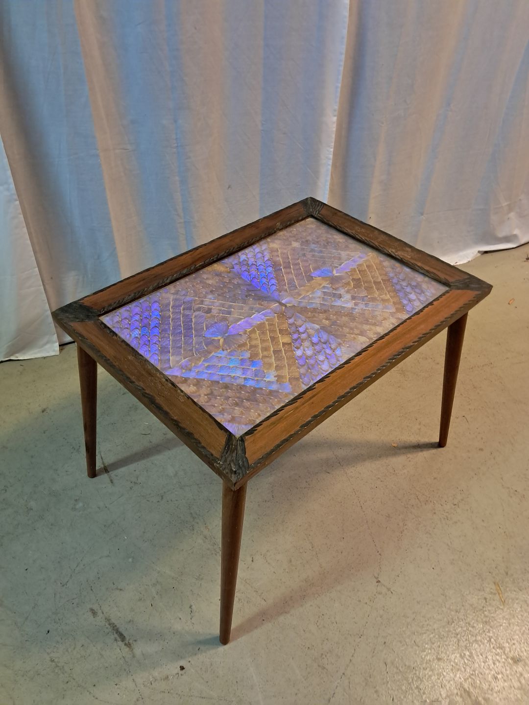 Sofabord i massivt bøgetræ med glasplade og sommerfuglevinger, fra 1980erne.