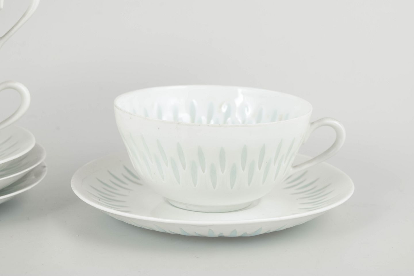 Sæt bestående af fire tekopper med tilhørende underkopper i hvidt porcelæn med gennembrudt “rice porcelain”-dekoration. De aflange perforeringer udfyldt med transparent glasur giver porcelænet et let og næsten translucent udtryk, mens de enkle, afrundede former er karakteristiske for Friedl Holzer-Kjellbergs sene modernistiske porcelænsdesign for Arabia.