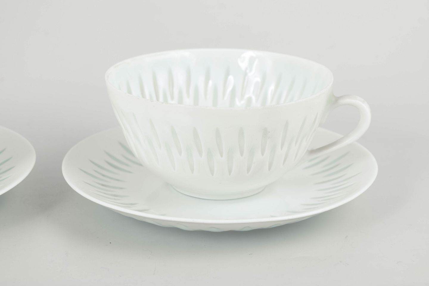 Sæt bestående af to tekopper med tilhørende underkopper i hvidt porcelæn med gennembrudt “rice porcelain”-dekoration. De aflange perforeringer udfyldt med transparent glasur skaber et let og næsten translucent udtryk, mens de enkle, afrundede former er karakteristiske for Friedl Holzer-Kjellbergs sene modernistiske porcelænsdesign for Arabia.