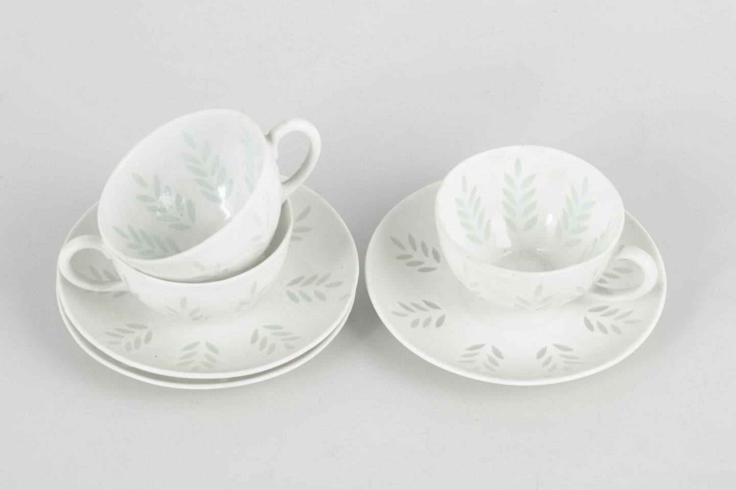 Elegant sæt bestående af tre mokkakopper med tilhørende underkopper i hvidt porcelæn, dekoreret med diskret bladornamentik udført i transparente, let grønligt tonede glasurfelter. Det lette og raffinerede udtryk samt de bløde, harmoniske former er karakteristisk for Friedl Holzer-Kjellbergs sene porcelænsdesign for Arabia.