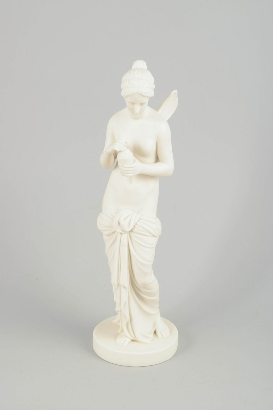 Biscuitporcelænsskulptur forestillende Psyche, den mytologiske ånd og sjælens gudinde. Figuren er udført i uglaseret, mat porcelæn med klassicistisk formsprog, fine anatomiske detaljer og blødt modelleret draperi. Psyche er afbildet stående med vinger og et lille kar i hænderne. Produceret hos Gustavsberg omkring år 1900.