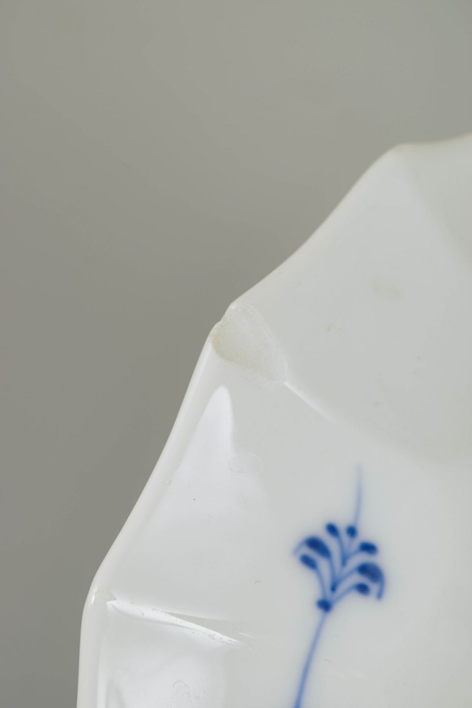 Sjældent fad i Musselmalet Riflet, udført i fliget form med let bølget rand og dekoreret med håndmalet koboltblå underglasur. Dekorationen er opdelt i felter med klassiske blomster- og rankemotiver, typisk for mere forfinede serveringsdele fra mellemkrigstiden.