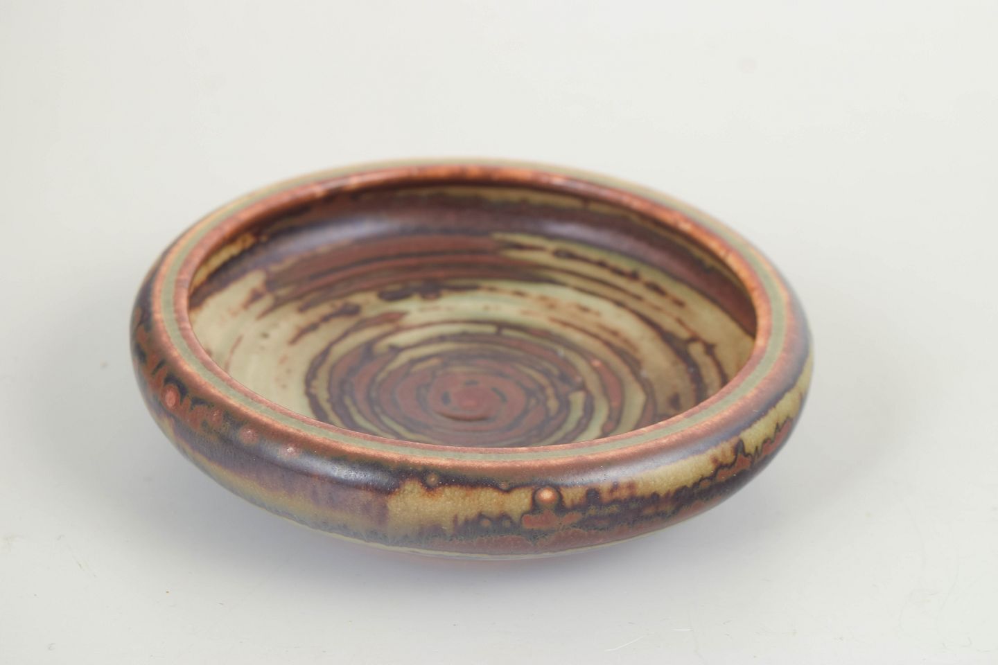 Lav skål udført i stentøj med koncentrisk, cirkulær dekoration og levende glasur i jordfarver med grønne, brune og rustfarvede nuancer. Den enkle, flade form kombineres med et markant grafisk udtryk i glasuren, som giver skålen et stærkt dekorativt præg.