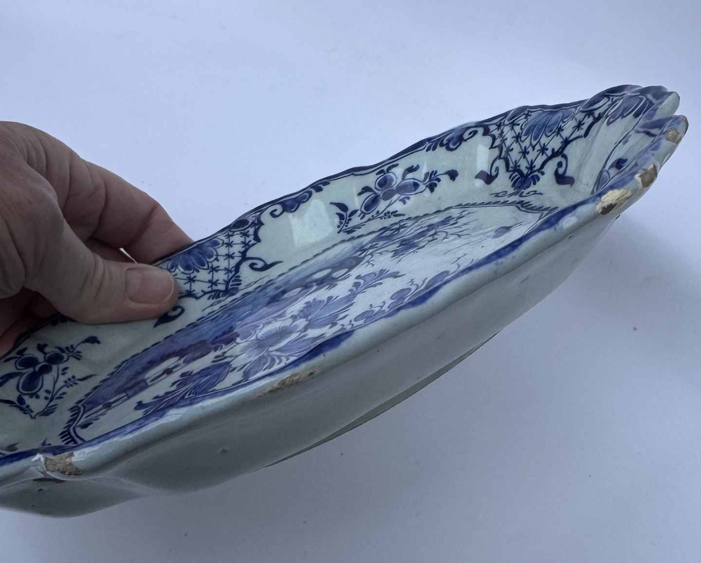 BLÅ BLOMSTER DEKORATION: Delft fajance fiskefad fra den nederlandske fabrik van Duyn fremstillet omkring 1765. Fremstår i god stand med alders relaterede brugsspor rundt på kanten i form af små overflade afslag i glasuren (se mange fotos). Der udover ingen skader eller reparationer. Fabriksmærket på bunden samt gammel label med dansk tekst. Mål:H.3,4 cm, L. 23,3 cm, D. 20,9 cm