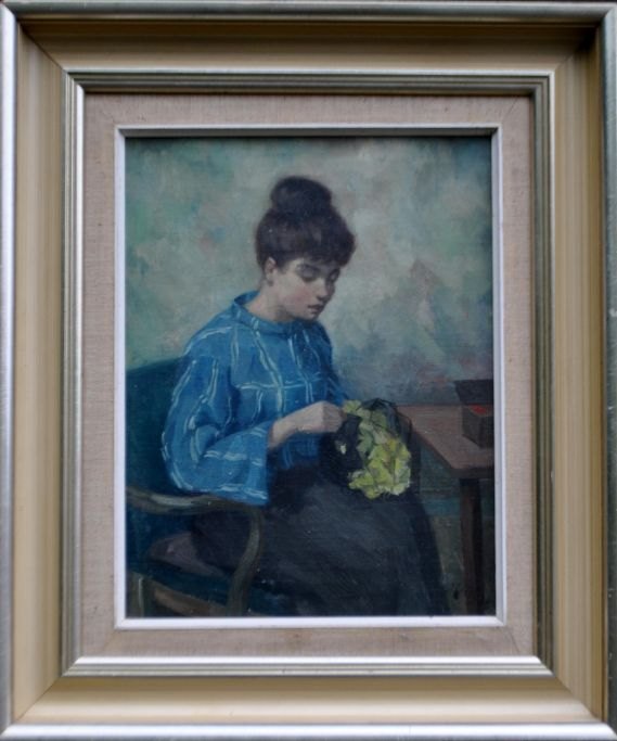Helme, Helge (1894 - 1987) Danmark: Kvinde med sytøj. Olie på lærred. Signeret: H. Helme. H: 35,5 cm. B: 27,5 cm.