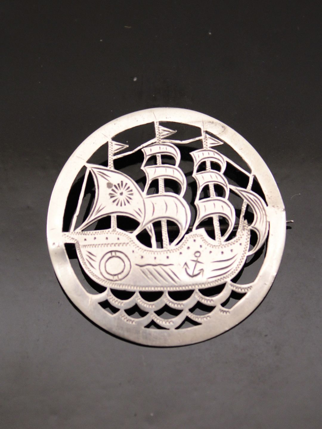 835 sølv broche D. 4 cm. med skib stempler 835s emne nr. 628619