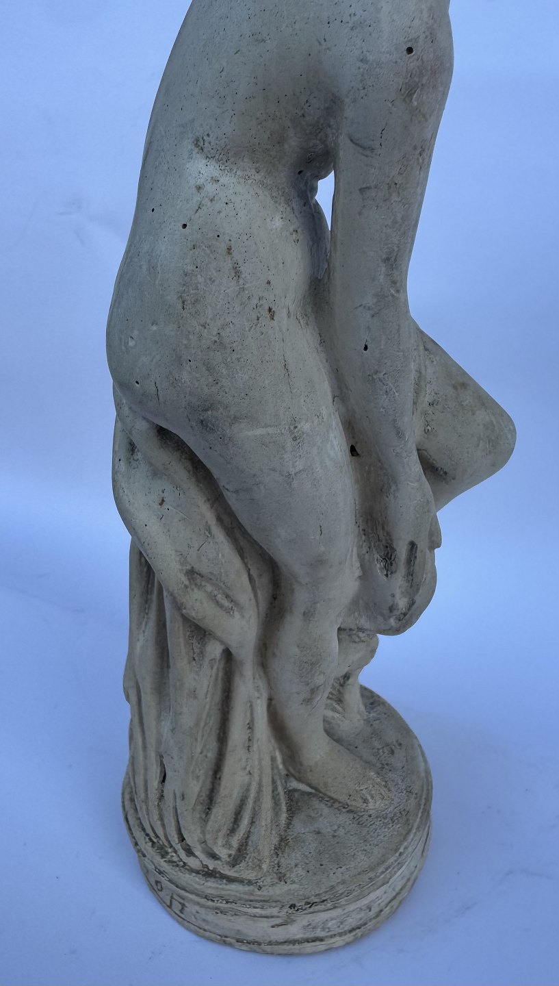 Venus, kærlighedens gudinde, forbereder sig på eller stiger ud af et bad. Skabt af den franske billedhugger Étienne-Maurice Falconets i 1767. Figuren er ofte brugt som havefigur og i mindre stue-venlige udgaver. Er fremstillet i både sten, marmor , keramik, gips og bronze gennem mere end 250 år. Denne figur er udført i gips formentlig i midten af 1900-tallet. Den fremstår i god stand uden skader eller reparationer. 25 cm høj.