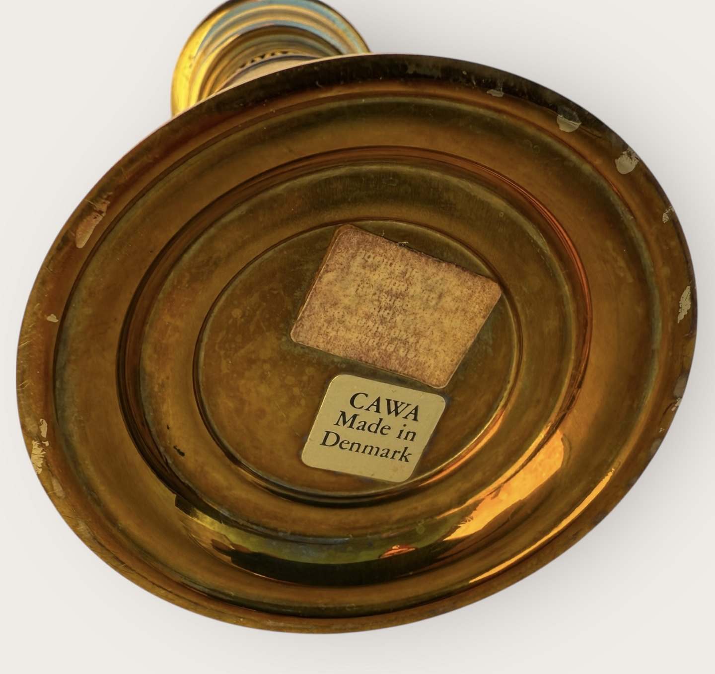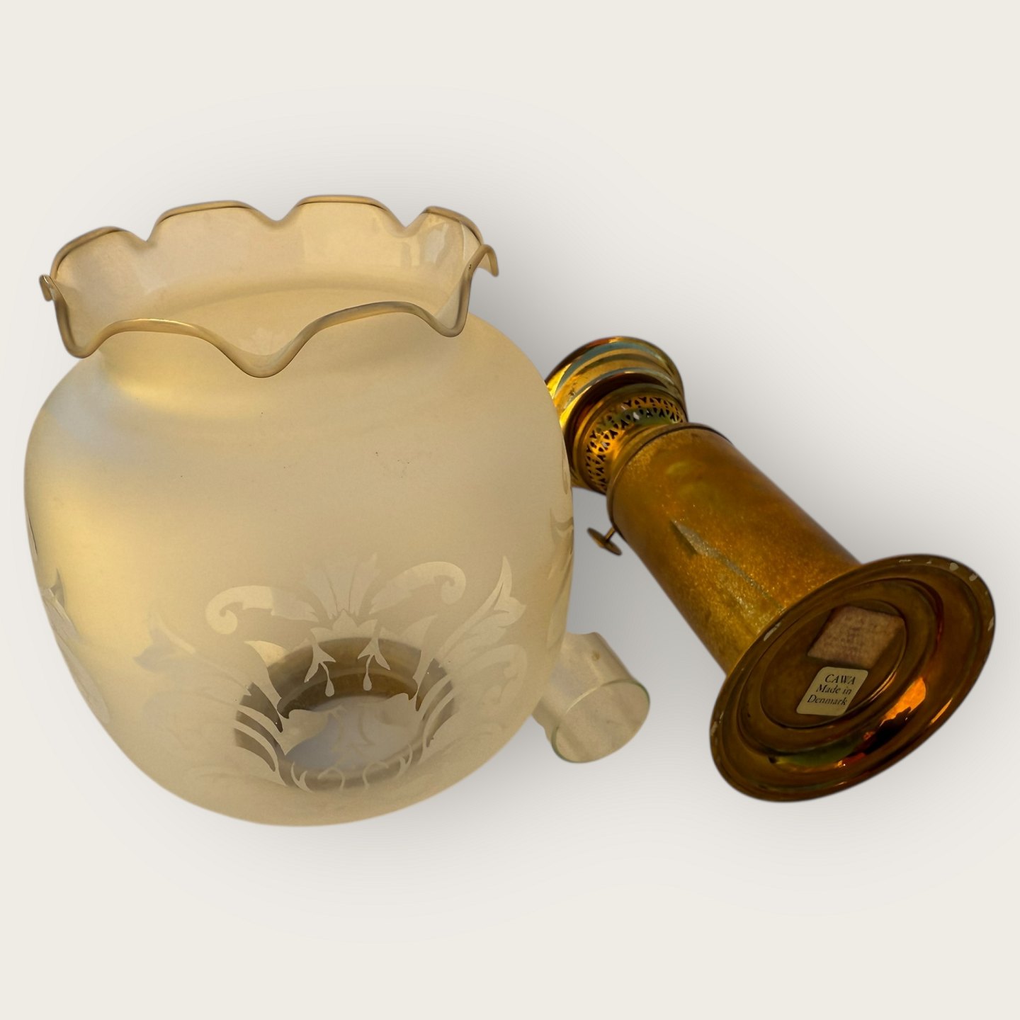 Cawa petroleumslampe, messing med glasskærm, højde 31cm, meget lille hak i brændeglasset øverst (se foto) *Ellers pæn patineret stand*