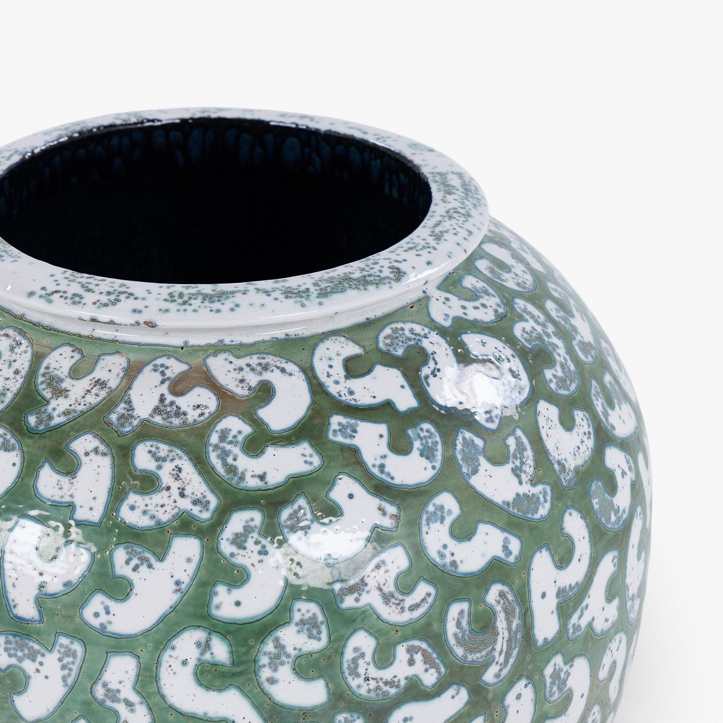 Kolossal krukke i stentøj med grøn glasur og hvide stafferinger. Signeret.