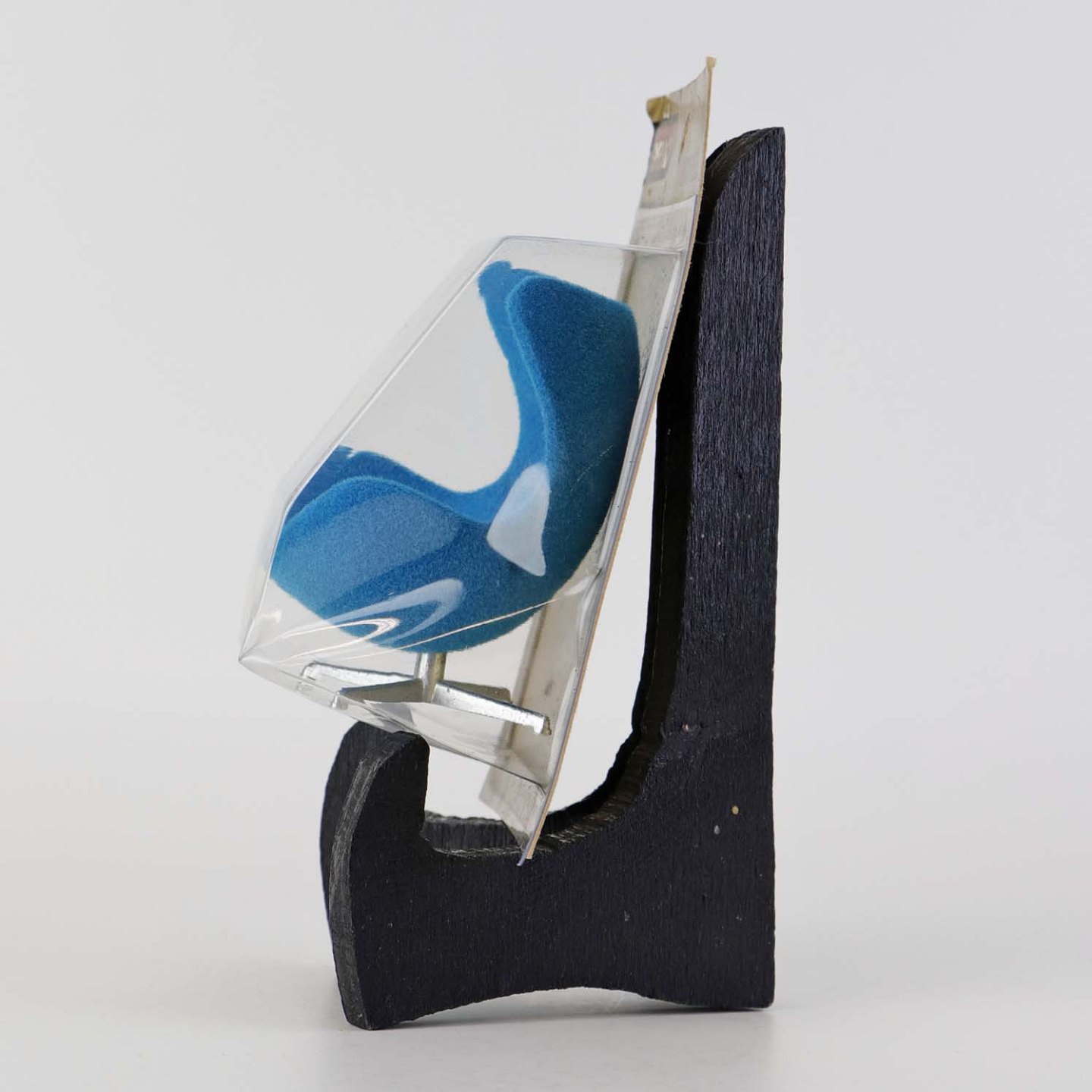 Blå miniature stol til dukkehus med model af Arne Jacobsen's lænestol Ægget. Model 31840/30