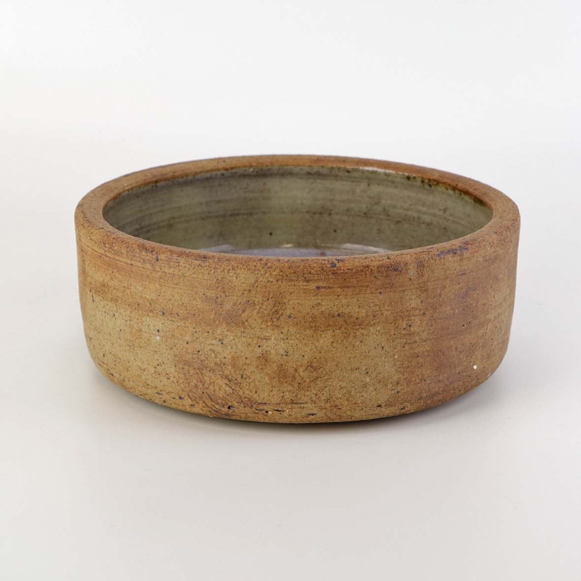 Rund skål i keramik med beige, grå og lyseblå glasur på indersiden samt uglaseret abstrakt mønster på ydersiden.