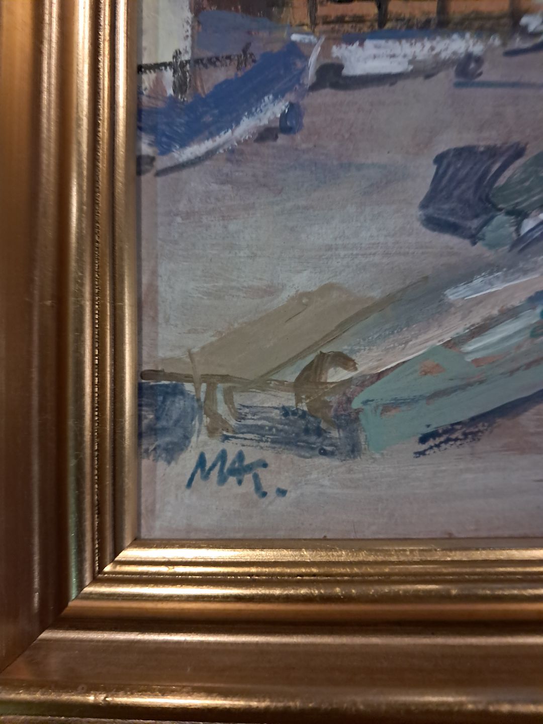 Maleri af Dragør Havn i guldmalet ramme, af : Mogens Amdi Thorsen (1924-2016)