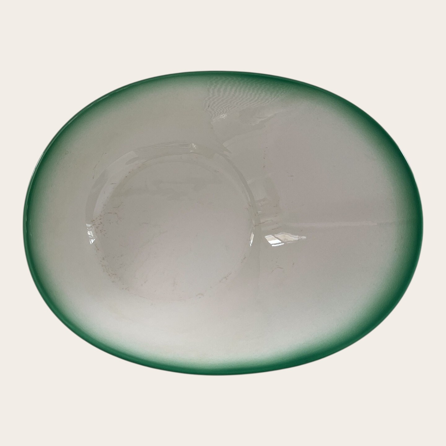 | Royal Copenhagen, Aluminia, Ursula, Asymmetrisk skål, Grøn / hvid, 1. sortering, 30,5cm lang, 24cm bred, 8cm høj, Design Ursula Munch Petersen *Med brugsspor*