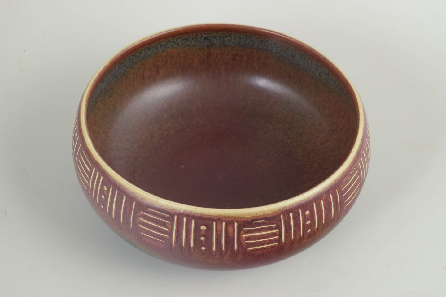 Unika, hånddrejet skål i stentøj med lav, afrundet form. Udført i varm brunrød glasur med mørkere inderside og dekoreret med indskårne, rytmiske linjer, karakteristisk for Carl-Harry Stålhanes eksperimenterende arbejder hos Rörstrand i slutningen af 1950’erne. Et tydeligt studiopræget værk med stærk materialefornemmelse og grafisk overflade.