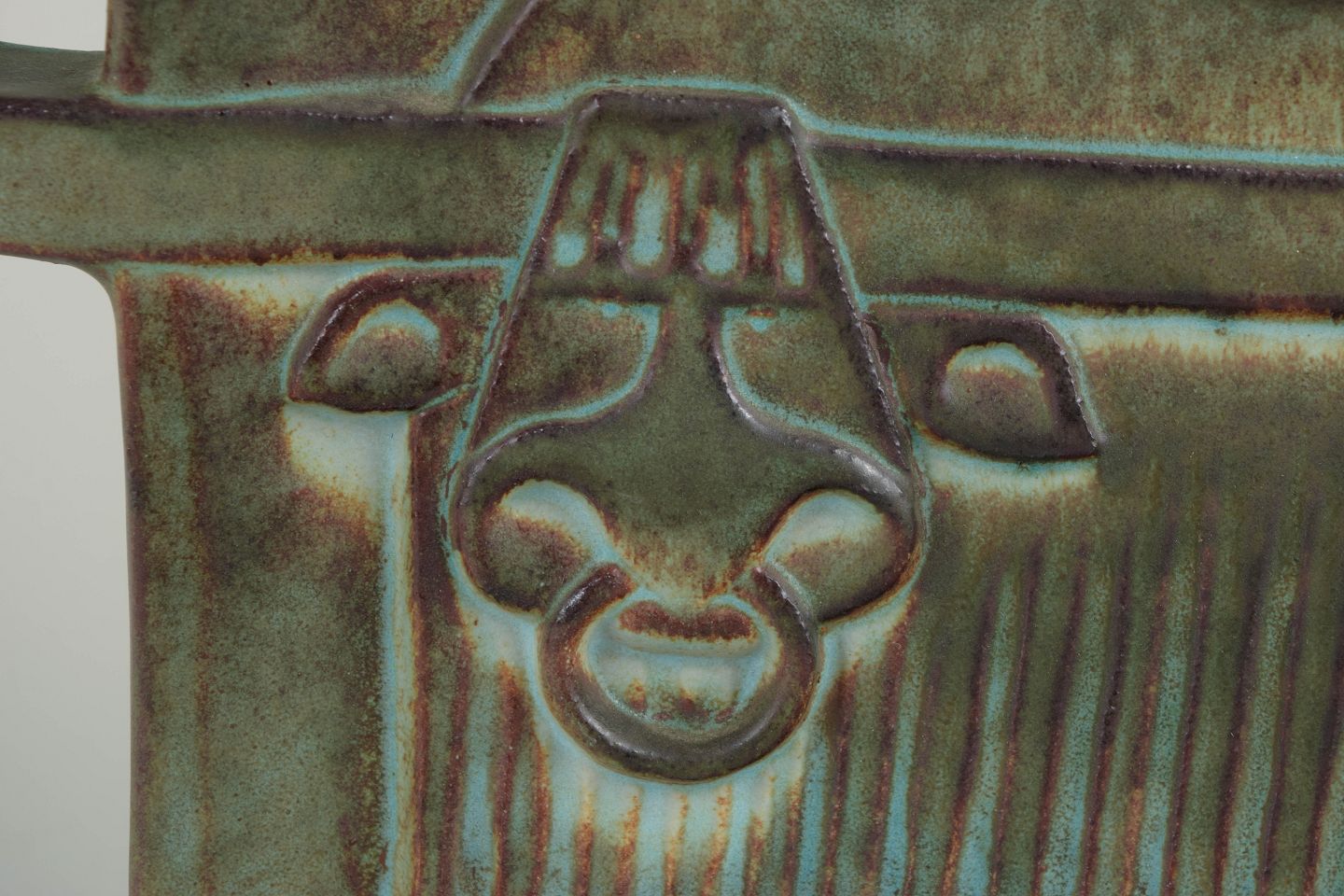 Relief i stentøj med stiliseret dyremotiv i lavt relief, udført i karakteristisk nordisk formsprog. Glasur i dæmpede jordtoner med grønne og brune nuancer, typisk for Höganäs’ produktion i perioden.