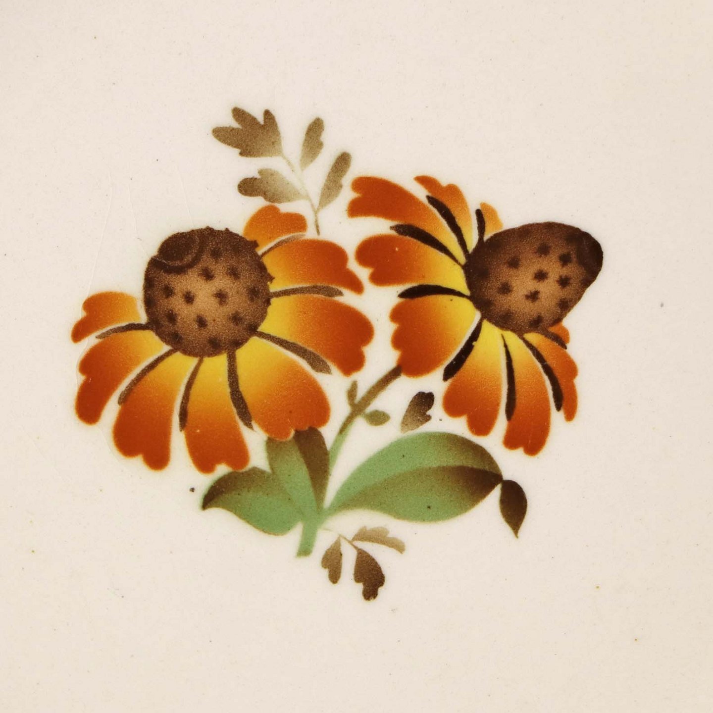 Fajancestel i stelform G med dekoration af orangegule blomster og grønne guirlander på lys baggrund med brun kant.