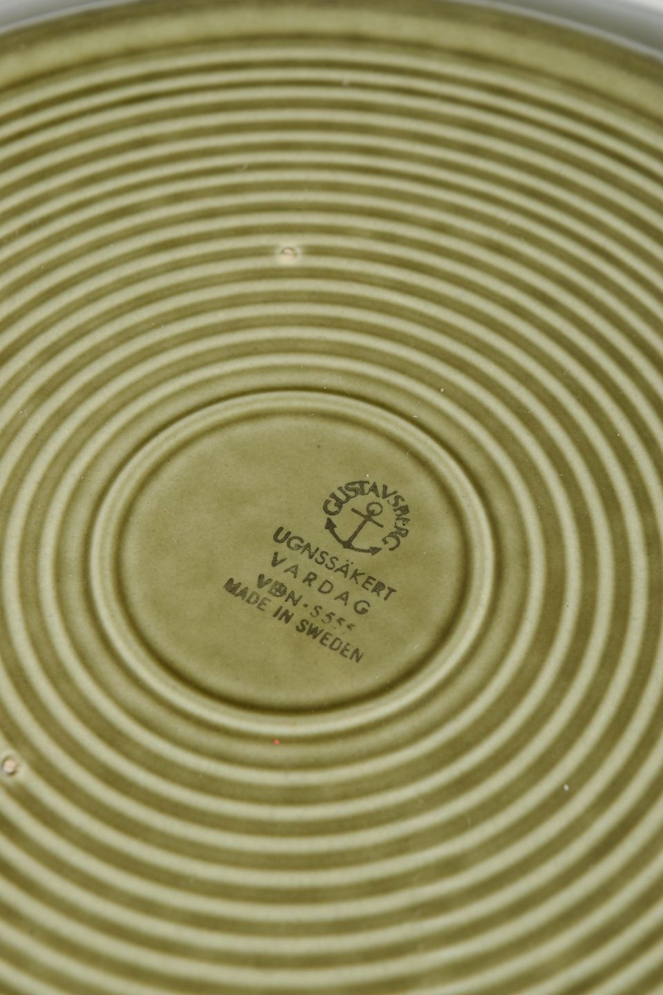 Sæt bestående af fire middagstallerkener i glaseret stentøj fra serien "Vardag". Tallerkenerne har et enkelt, funktionelt formsprog med bred fane og dyb spejl, udført i karakteristisk grøn glasur med mørk kant, typisk for Stig Lindbergs hverdagsorienterede design fra 1970’erne.