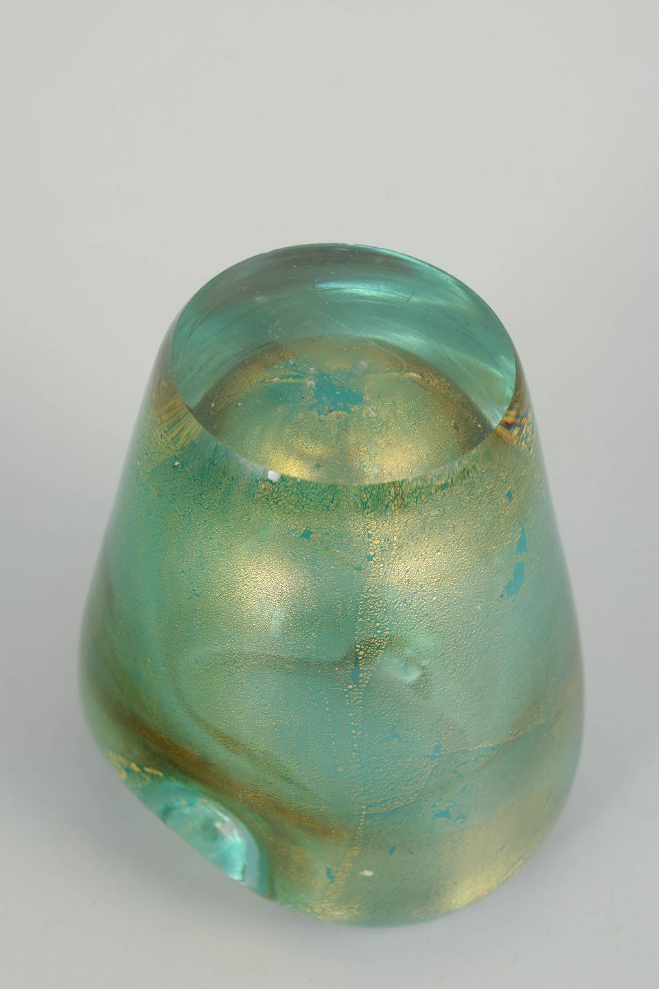 Skulpturel vase i mundblæst kunstglas med fri, organisk åbning og let asymmetrisk kant. Glasset fremstår i klare turkisgrønne nuancer med gyldne indeslutninger, der giver dybde og et blødt, levende farvespil. Den massive, klare fod danner en stabil base og kontrasterer elegant mod den farvede overdel. Formen og materialebehandlingen er karakteristisk for muranesisk kunstglas fra midten af det 20. århundrede.