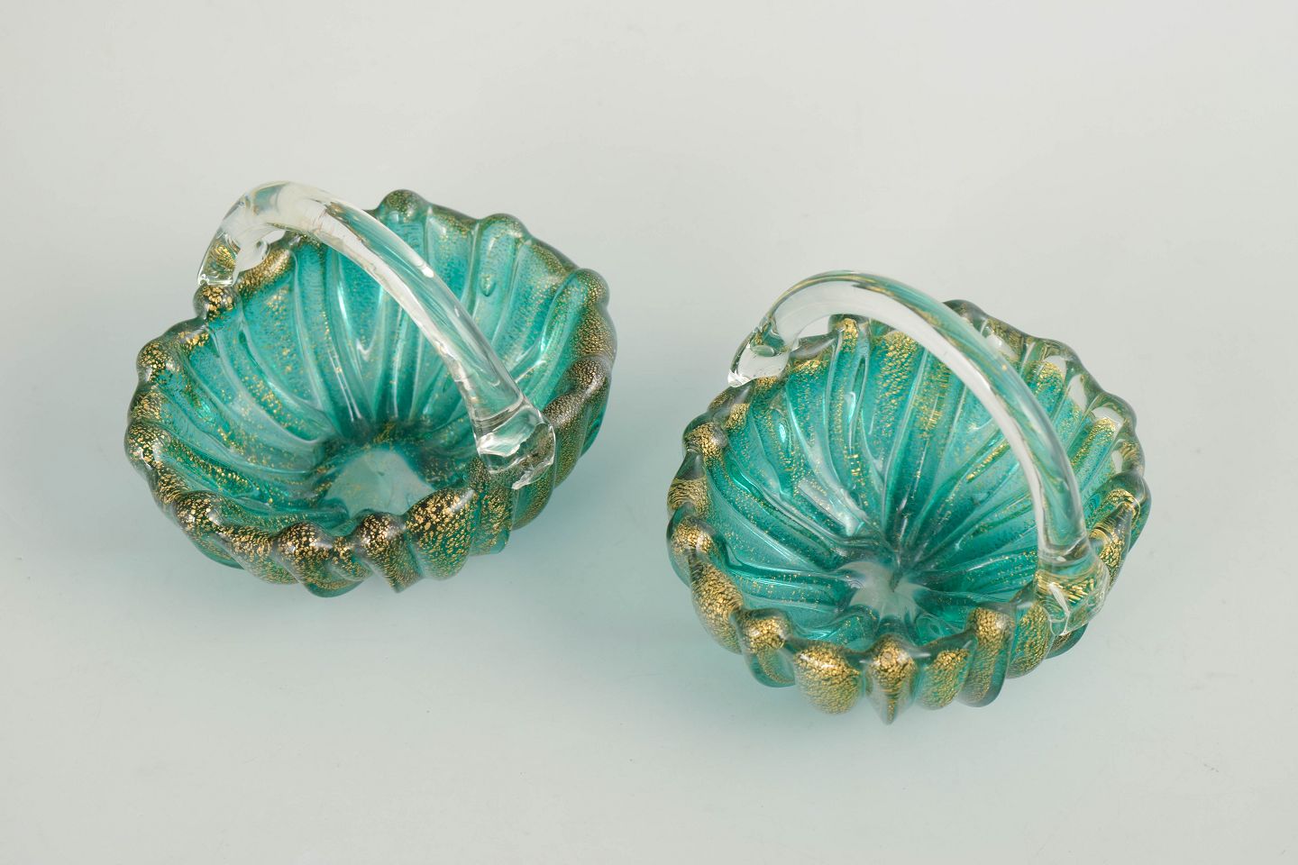 Par dekorative kurve i mundblæst kunstglas med organisk, bølget korpus og klare, opadbøjede hanke. Glasset er udført i turkisgrønne nuancer med gyldne indeslutninger, som giver overfladen dybde og et levende farvespil. Formen og dekorationen er karakteristisk for muranesisk kunstglas fra midten af det 20. århundrede, hvor funktionelle objekter ofte blev udformet som små skulpturelle værker.