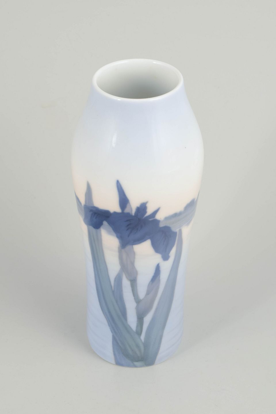 Høj, let facetteret vase i glaseret porcelæn med håndmalet underglasurdekoration af irisblomster i dybe blå nuancer med grønne stilke, udført mod en lys, let tonet bund. Dekorationen er elegant strakt langs vasens lodrette form og afspejler Royal Copenhagens naturalistiske formsprog i 1920’erne.