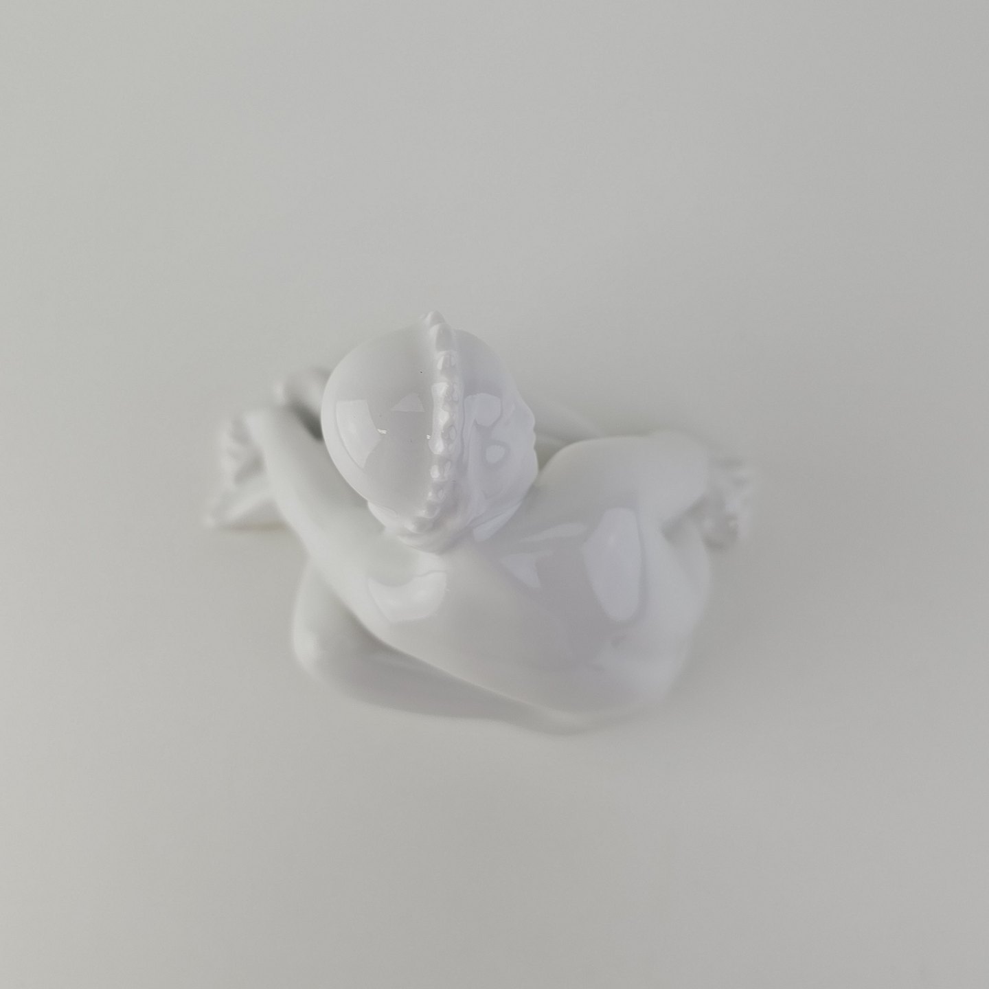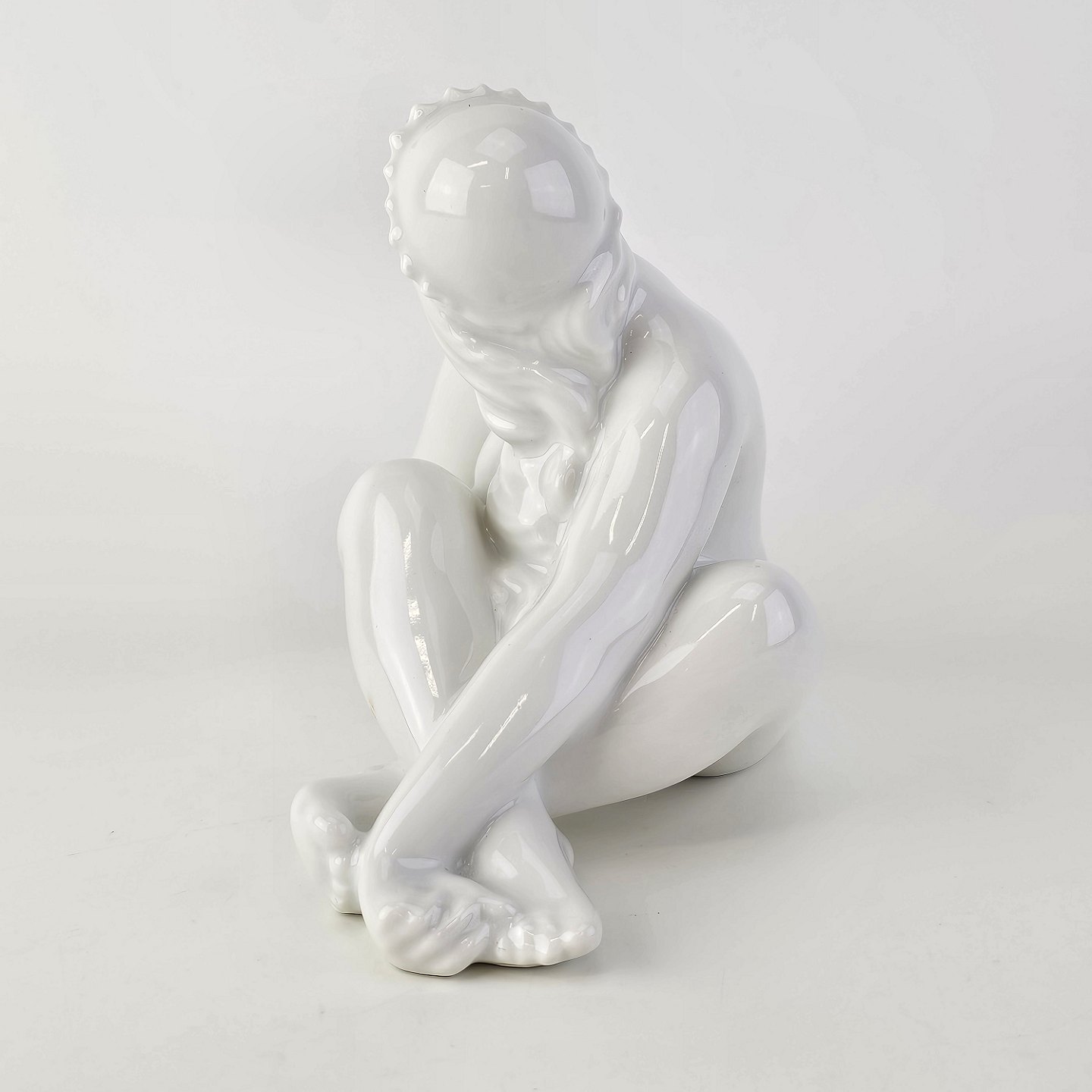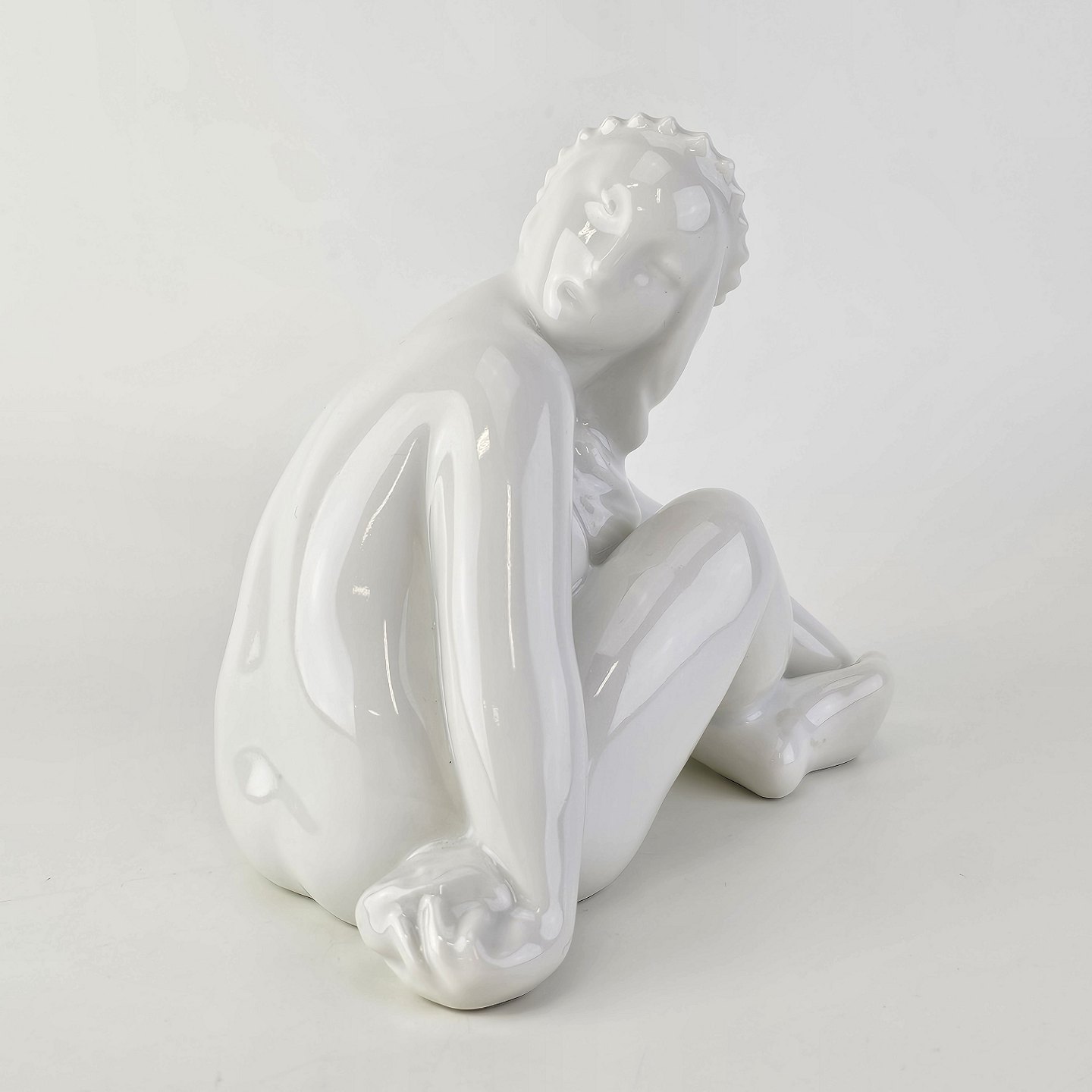 Figur i hvidt porcelæn med motiv af en siddende pige